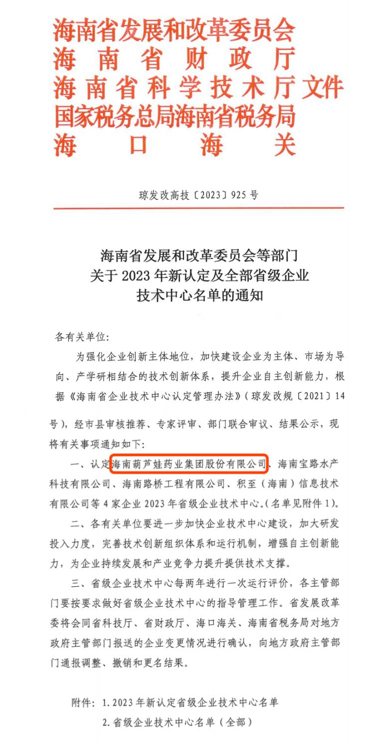 近日,海南省发改委等多部门联合公布了《关于2023年新认定及全部省级企业技术中心名单的通知》,其中,海南乐天使药业集团股份有限公司成功通过评审,被认定为省级企业技术中心,是本次获批的4家企业之一。
